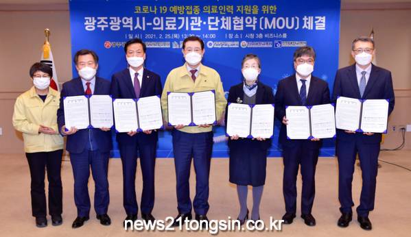 광주광역시와 광주시의사회, 대한병원협회 광주·전남병원회, 광주시간호사회, 전남대학교병원, 조선대학교병원은 25일 오후 시청 비즈니스룸에서 신속한 코로나19 예방접종을 위한 업무협약을 체결했다.