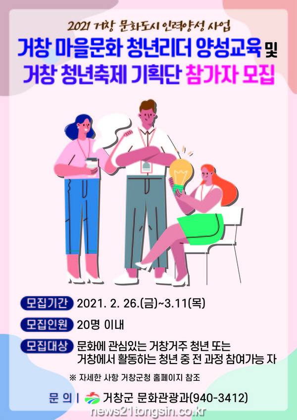 거창군은 오는 3월 11일까지 ‘거창 마을문화 청년리더 양성교육 및 거창 청년축제 기획단’ 참가자를 모집한다고 26일 전했다.