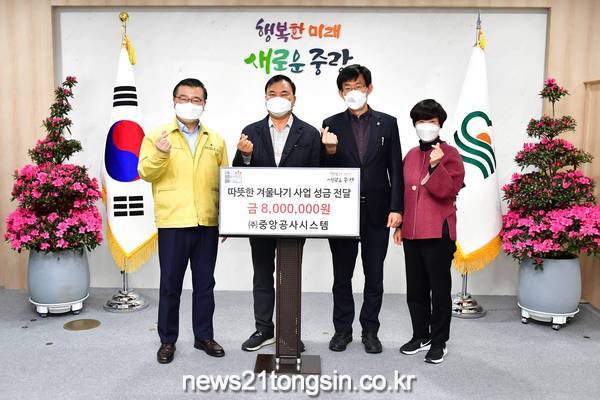 중랑구(구청장 류경기)는 4일 상봉2동 소재 ㈜중앙공사시스템(대표 송일상)이 ‘2021년 희망온돌 따뜻한 겨울나기’ 성금 800만 원을 기탁했다고 밝혔다.