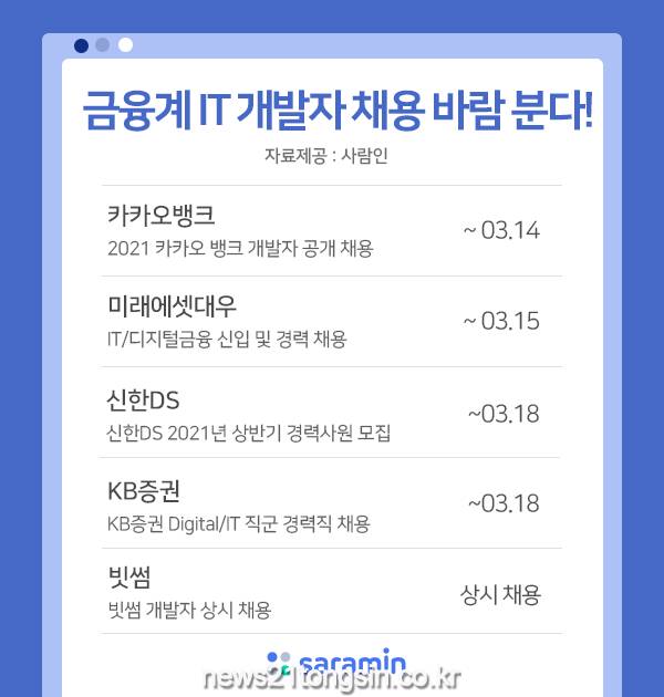 금융계에도 비대면과 디지털 전환이 화두로 떠오르면서 금융사들이 IT 개발자를 대거 채용하고 있다. 과거와는 달리 핀테크 전문 기업뿐 아니라 전통적인 금융사들도 IT 조직을 확장하거나 IT 전문 계열사의 개발 인력을 확충하면서 개발자 채용문이 넓어진 것이 특징이다. 구인구직 매칭 플랫폼 사람인(www.saramin.co.kr, 대표 김용환)이 올봄 주요 금융 기업들의 IT 개발자 채용 소식을 정리했다.