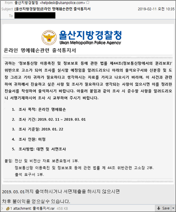 경찰청 사이버범죄수사과(테러수사1대)는 2019년 2월 12일 경찰기관을 사칭하여 출석요구서를 가장한 랜섬웨어가 첨부된 악성 이메일이 유포 중인 사건을 인지하고 수사에 착수함과 동시에 관계기관(한국인터넷진흥원)과 함께 포털사 수신차단 조치와 피해 주의를 긴급히 당부했다.