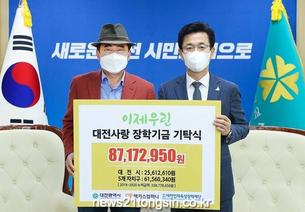 대전시와 대전인재육성장학재단은 9일 오후 2시 시청 응접실에서 ㈜맥키스컴퍼니 조웅래 회장이 장학기금 2,561만 원을 기탁했다고 밝혔다.