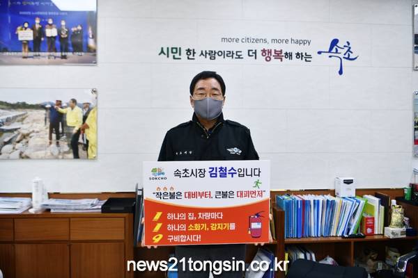 김철수 속초시장이 11일 집무실에서 화재안전의 중요성을 알리는 ‘119릴레이 챌린지’ 캠페인에 동참했다.