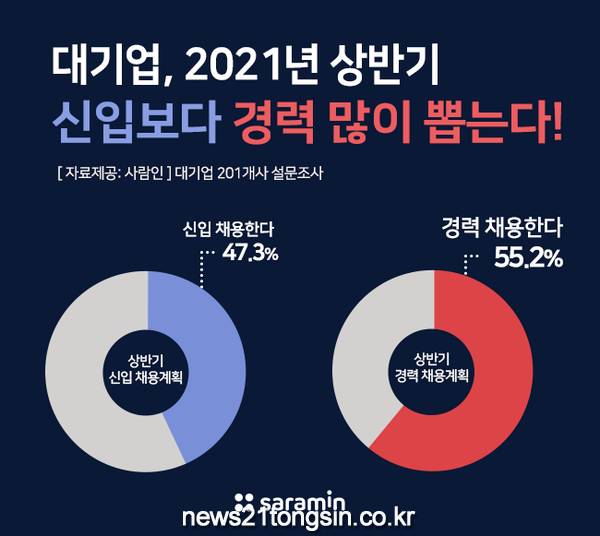 구인구직 매칭플랫폼 사람인(www.saramin.co.kr 대표 김용환)이 대기업 201개사를 대상으로 ‘2021년 상반기 채용 계획’에 대해 조사한 결과, 경력을 채용한다는 기업이 55.2%로 신입을 뽑는다는 곳(47.3%)보다 7.9%p 높았다.