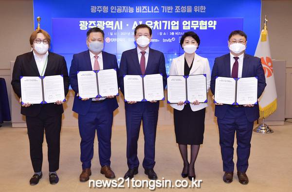 광주광역시는 15일 오후 시청 비즈니스룸에서 인공지능(AI) 전문기업인 ㈜아크릴, ㈜이노뎁, ㈜인비즈, ㈜코랩과 광주형 인공지능 비즈니스 기반 조성을 위한 82~85번째 업무협약을 체결하고 각 기업별 본사이전 또는 지역사무소 설립을 통해 광주 인공지능 생태계 조성에 적극 협력키로 했다.