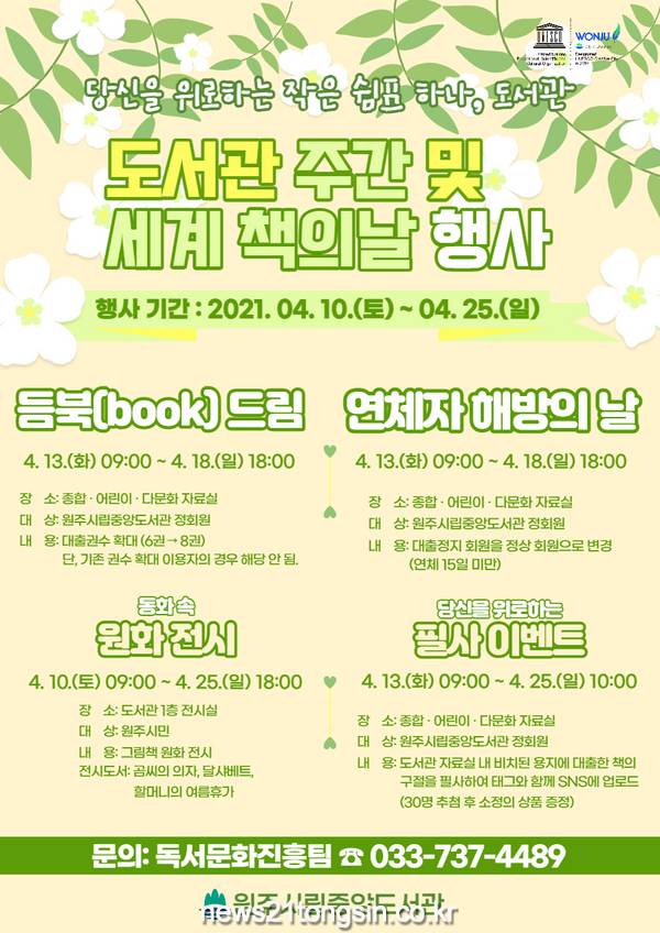 원주시립중앙도서관(관장 안준기)이 제57회 도서관 주간 및 4월 23일 세계 책의 날을 맞아 풍성한 행사를 마련한다.