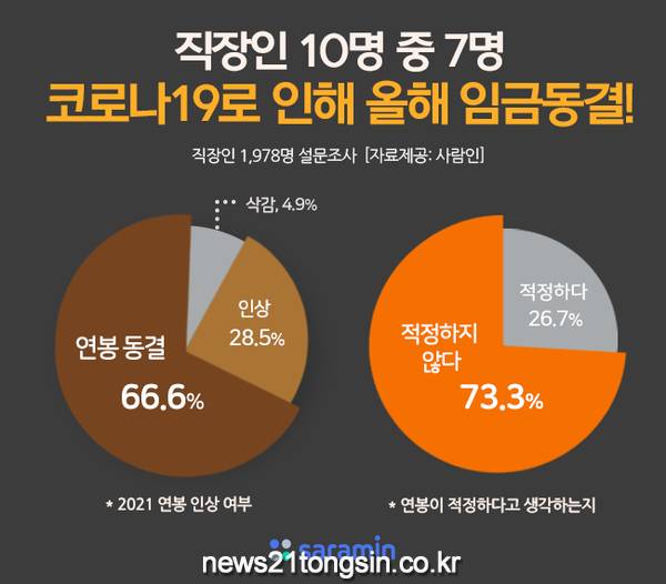 구인구직 매칭 플랫폼 사람인(www.saramin.co.kr 대표 김용환)이 직장인 1,978명을 대상으로 ‘2021년 희망연봉’에 대해 조사한 결과 응답자의 66.6%가 ‘올해 연봉이 동결됐다’고 밝혔다. ‘인상했다’는 28.5%, 삭감됐다는 이들도 4.9%였다.