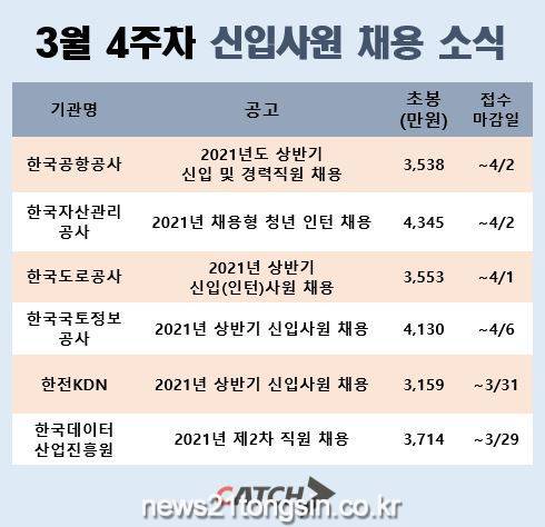 23일 취업정보사이트 캐치의 채용 공고에 따르면 한국공항공사, 한국 자산관리공사, 한국도로공사, 한국국토정보공사, 한전KDN, 한국데이터산업진흥원에서 신입/인턴사원 인재를 모집하고 있다.