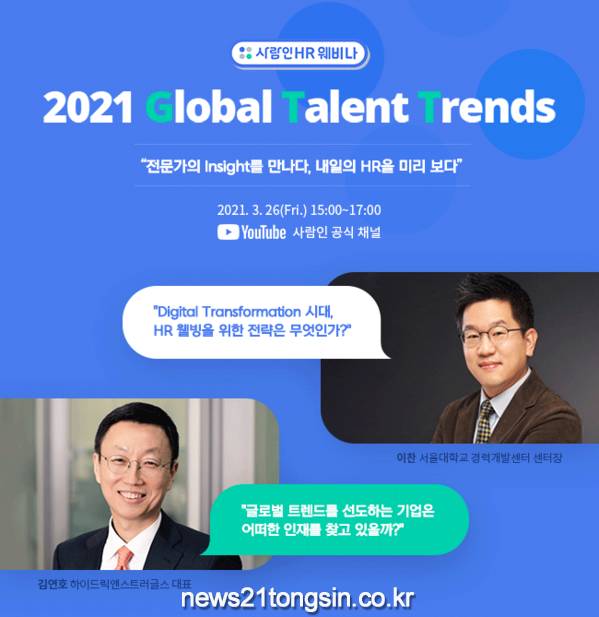 구인구직 매칭플랫폼 사람인을 운영하는 사람인HR(143240, 대표 김용환)은 오는 26일 ‘2021 Global Talent Trends’를 주제로 웨비나(온라인 세미나)를 개최한다고 밝혔다.