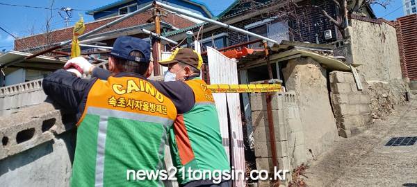 이에 속초시지역자율방재단은 매일 방역활동을 마치고 3~4명씩 7개조를 편성하여 시간대별로 해당 지역을 순찰하고 있으며, 사고 발생이 우려되는 구역과 빈집을 중심으로 안전띠를 설치하여 사고를 미연에 방지하는 등 예찰활동에 앞장서고 있다.
