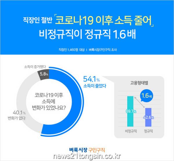 벼룩시장구인구직이 직장인 1460명을 대상으로 ‘코로나19 이후 소득 변화’에 대한 설문조사를 진행한 결과, 응답자의 54.1%가 ‘소득이 줄었다’고 답했다. 특히 비정규직 근로자의 경우 ‘코로나19의 영향으로 소득이 줄었다’고 답한 비율이 69.7%로, 정규직 근로자(42.6%)의 약 1.6배 수준인 것으로 나타났다.