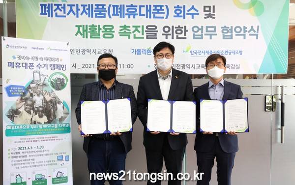 인천광역시교육청(교육감 도성훈)은 30일 ‘잠자는 서랍속 자원 캐기’ 공동실천 행사의 원활한 추진을 위해 가톨릭환경연대, 한국전자제품자원순환공제조합과 협약을 체결하였다.