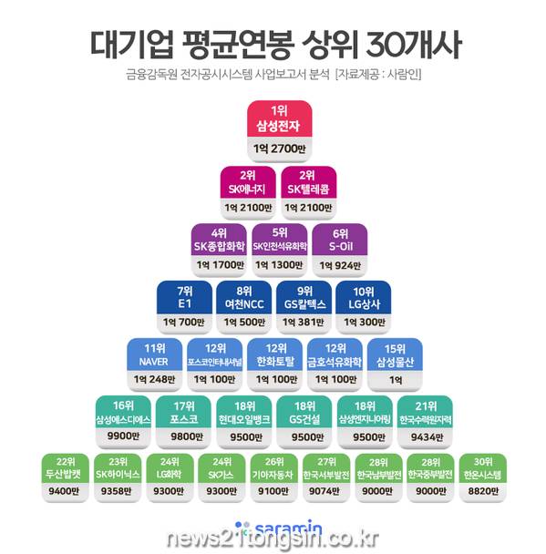 직원 평균 급여가 가장 높은 기업은 ▲삼성전자로 1인당 평균 1억 2,700만원을 지급했다.