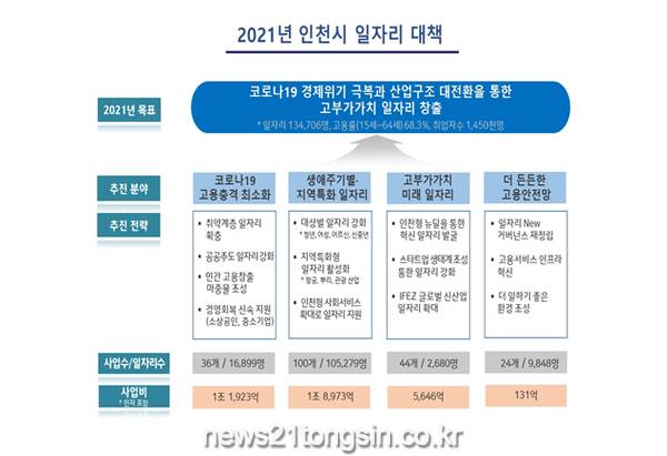 인천광역시(시장 박남춘)는 코로나19 경제위기 극복과 산업구조 대전환을 통한 고부가가치 일자리 창출을 위해 2021년 일자리대책을 수립했다고 밝혔다.