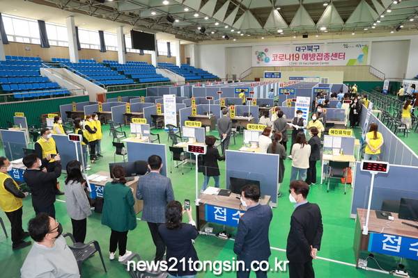 (대구=뉴스21통신) 유재원기자 = 북구청은 4월 1일(목) 오후 2시 코로나19 북구예방접종센터(대구복합스포츠타운 시민체육관)에서 백신 접종 모의훈련을 가졌다.