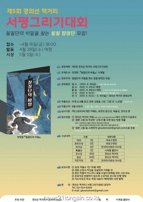 접수 기간은 오는 4월 16일까지이며, 인터넷 경의선 책거리 카페(cafe.naver.com/gbookstreet)에서 참가신청서 서식을 내려 받아 작성한 뒤 그림과 함께 제출하면 된다.