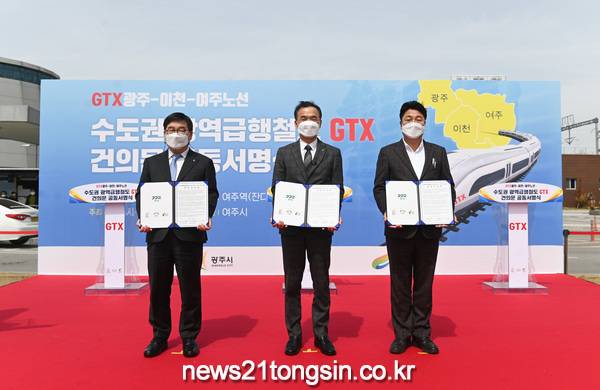 경기 동․남부권 도시인 여주․이천․광주에 수도권광역급행철도인 GTX를 유치하기 위해 힘을 뭉친 이항진 여주시장과 엄태준 이천시장, 신동헌 광주시장은 세 도시가 GTX로 연결돼야 하는 당위성을 환영사를 통해 밝혔다.