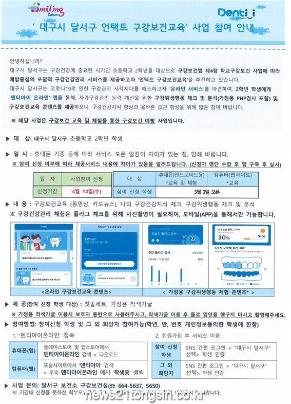 (대구=뉴스21통신) 박창남기자 = 달서구는 5월 3일부터 조기 구강건강교육을 위해 초등학교 2학년 학생들을 대상으로 '덴티아이 온라인 앱' 을 활용, 언택트 구강건강프로그램을 운영한다고 밝혔다.