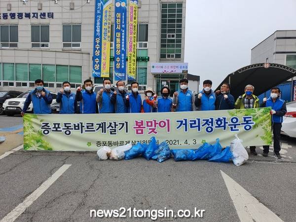 증포동 바르게살기위원회(위원장 정문광)위원 15여명은 4월3일 증포사거리부터 이마트 사거리 일대의 쓰레기 수거 및 도로변 환경 정비 등 봄맞이 대청소를 실시하였다.
