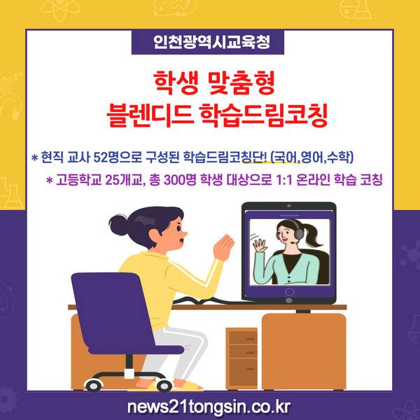인천광역시교육청(교육감 도성훈)은 4월부터 7월까지 관내 고등학교 25개교, 총 300명의 학생들을 대상으로 ‘2021 학생 맞춤형 블렌디드 학습드림코칭’을 실시한다고 밝혔다.