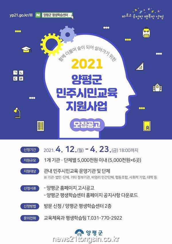 함께 더불어 숲이 되어 살아가기 위한『2021 양평군 민주시민교육 지원사업』은 관내 민간 기관·단체들을 대상으로 지역사회 이해 기반의 시민교육을 발굴하고 관내 주민들의 정주의식을 향상시키기 위해 1개 기관·단체당 5백만원을 지원한다.