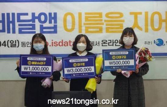 접수된 12,157건의 이름 중 활용성(대중성), 창의성, 명료성, 스토리 등 평가지표를 마련해 기업내부 심사, 전문가 심사 등 공정한 과정을 거쳐 ▲1위(1명) ‘대구로’ ▲2위(1명) ‘배달do대구’ ▲3위(1명) ‘다대구요’를 선정해 4월 9일(금) 대구형 배달앱 홈페이지(app.isdata.kr)에 당선자를 발표했다.
