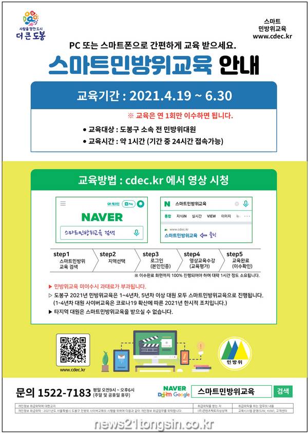 한편, 도봉구는 지난 2019년부터 5년차 이상의 민방위대원을 대상으로 비상소집훈련 부담완화와 편리한 교육을 위해 스마트 민방위교육을 실시하여 왔으며, 작년에 이어 올해는 코로나19의 영향으로 사이버교육을 모든 민방위대원에게 확대 실시하게 됐다.