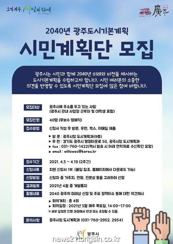 광주시는 시민과 함께 2040년 광주 미래와 비전을 제시하는 도시기본계획을 수립한다고 13일 밝혔다.