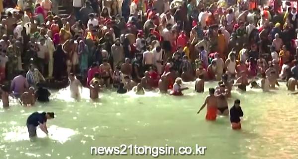 힌두교 최대 축제인 쿰브멜라가 열리고 있는 인도에서 코로나19 일일 확진자가 18만명 이상 발생해 사상최다를 기록한 상황에서 매일 수십만명의 힌두교인들이 노마스크로 갠지스강에 목욕하기 위해 모이고 있다.