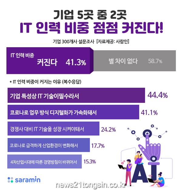 구인구직 매칭 플랫폼 사람인(www.saramin.co.kr 대표 김용환)이 기업 300개사를 대상으로 ‘IT인력 비중 변화’에 대해 조사한 결과 41.3%가 ‘최근 IT인력 비중이 커지고 있다’고 답했다. 그 이유로는 ‘기업 특성상 IT기술이 필수라서’(44.4%, 복수응답)와 ‘코로나19로 업무 방식 디지털화가 가속화 돼서’(41.1%)가 비등했다. 그 외 ‘경쟁사 대비 IT기술을 성장 시켜야 돼서’(24.2%), ‘코로나19로 급격하게 산업 환경이 변화해서’(17.7%), '4차산업혁명 시대에 따른 경영방침이 바뀌어서'(15.3%) 등이 있었다.