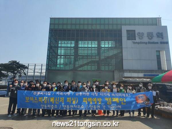 양동면(면장 박대식)에서는 최근 보이스피싱으로 인한 피해를 최소화 하고자 4월 19일 오전 10시 양동역 앞에서 “보이스피싱 피해 예방 캠페인”을 실시하였다.