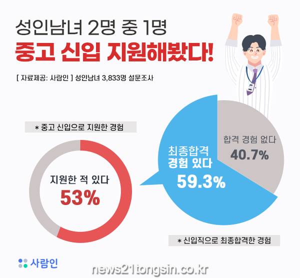 구인구직 매칭 플랫폼 사람인(www.saramin.co.kr, 대표 김용환)이 성인남녀 3,833명을 대상으로 ‘경력을 포기하고 중고 신입으로 지원한 경험’을 조사한 결과, 53%가 중고 신입 지원 경험이 ‘있다’고 답했다.