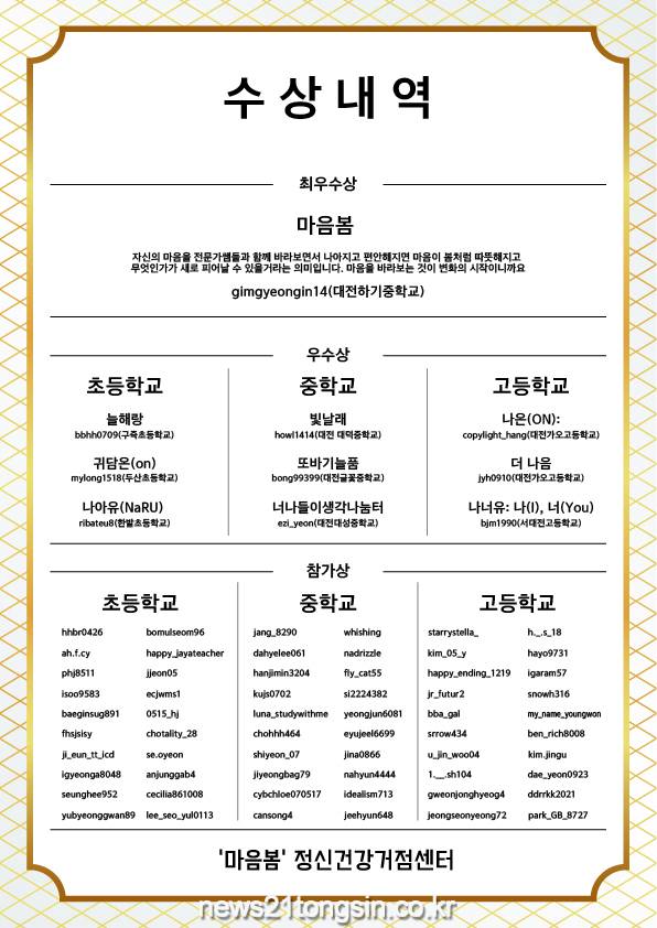 자신의 마음을 전문가들과 함께 바라보는 것이 변화의 시작이라는 의미를 담은 ‘마음봄’(대전하기중학교)이 최우수상의 영예를 얻게 되었고, 초·중·고 교육 가족이 응모한 ‘늘해랑’ ‘빛날래’ ‘나온(ON)’ 등 9개의 이름이 우수상을 수상하였다.