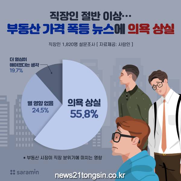 구인구직 매칭 플랫폼 사람인(www.saramin.co.kr 대표 김용환)이 직장인 1,820명에게 ‘부동산 시장이 직장 분위기에 미치는 영향’에 대해 설문조사 한 결과 응답자의 55.8%가 ‘근로의욕이 상실된다’고 답했다. ‘더 열심히 해야겠다’는 생각이 드는 직장인은 19.7% 뿐이었다.