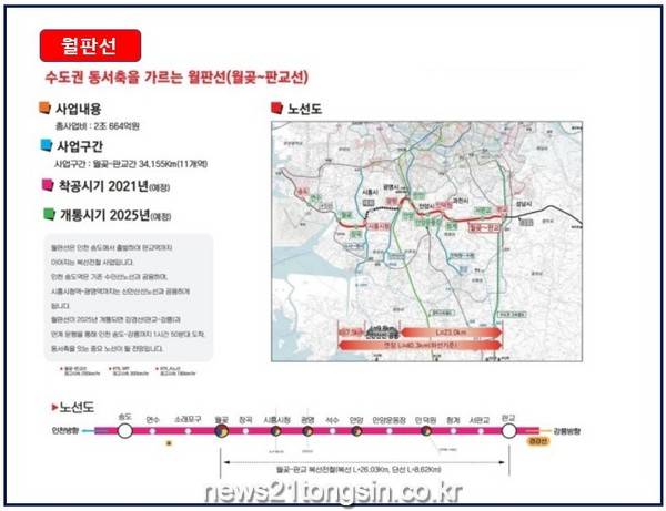 월판선은 인천 송도에서 판교역까지 이어지는 복선전철 사업으로 강경선(판교-강릉)과 연계 운행을 통해 인천송도-강릉까지 1시간 50분 소요,동서울을 잇는 중요 노선이 될 전망이다.