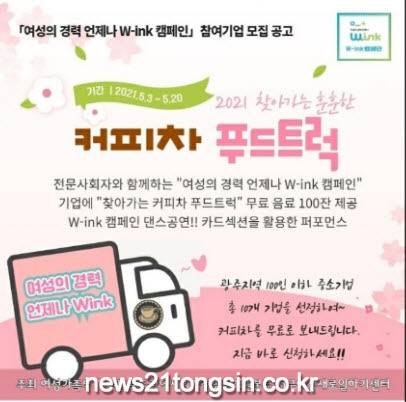 올해는 서구여성새일센터에서 지역 내 중소기업 10곳을 찾아가 커피트럭을 운영하며 코로나19 장기화로 지친 기업 종사자들에게 음료를 무료 제공하고, 종사자들이 참여하는 윙크 캠페인 댄스와 희망메시지 카드섹션 퍼포먼스 등 영상을 촬영해 경력단절 예방의 중요성을 알릴 계획이다. 윙크 캠페인 영상은 올해 7월부터 인스타, 페이스북, 유튜브 등에 게시할 예정이다.