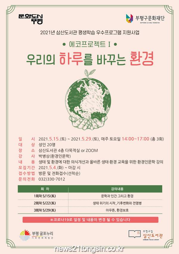 부평구(차준택 구청장)구립 삼산도서관이 오는 15일부터 29일까지 진행하는 생태·환경교육 ‘에코프로젝트Ⅰ: 우리의 하루를 바꾸는 환경’에 참여할 성인 주민 20명을 선착순으로 모집한다.
