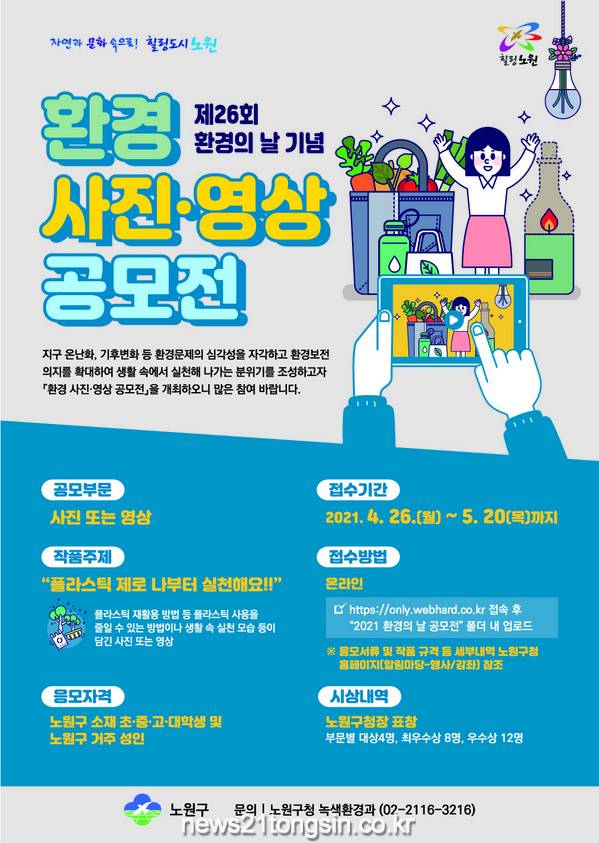서울 노원구(구청장 오승록)가 제26회 환경의 날(6.5)을 맞아 ‘플라스틱 제로 나부터 실천해요’란 주제로 사진·영상 공모전을 실시한다고 밝혔다.