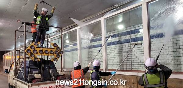 이번 세척작업은 지역에 위치한 지하보차도 6개소, 보도육교 6개소, 방음벽 2개소 등 총 14개소를 대상으로 실시돼 제설재와 매연, 연기 등으로 오염된 시설물의 묵은 때를 말끔히 씻어냈다.