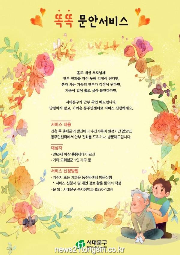 문석진 구청장은 “서대문구에서 홀로 사시는 부모님께 안부전화를 자주 못해 불안하거나 1인 가구, 2인 가구, 한부모가정이어서 자신과 가족의 안부가 걱정되는 구민 분들은 거주지 또는 가까운 동주민센터에 서비스 신청을 해 달라”고 당부했다.