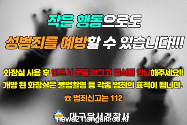 (대구=뉴스21통신) 박창남기자 = 대구달서경찰서는 최근 지하철역·상가·그린공원 등 공용화장실에서 성범죄가 빈발함에 따라 성범죄에 취약한 공용화장실에 사회적 약자인 여성대상 범죄예방과 안전화장실 환경조성을 위해 비상벨 및 안심스크린 등 방범 시설물 설치 '여심잡기 딩동' 프로젝트를 추진하기로 하였다.