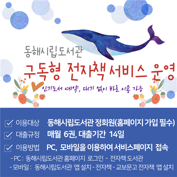 동해시(시장 심규언)는 코로나19로 인한 비대면 자료서비스 수요 증가에 대응하기 위해 오는 17일부터 구독형 전자책 서비스(스트리밍 방식)를 운영한다고 밝혔다.