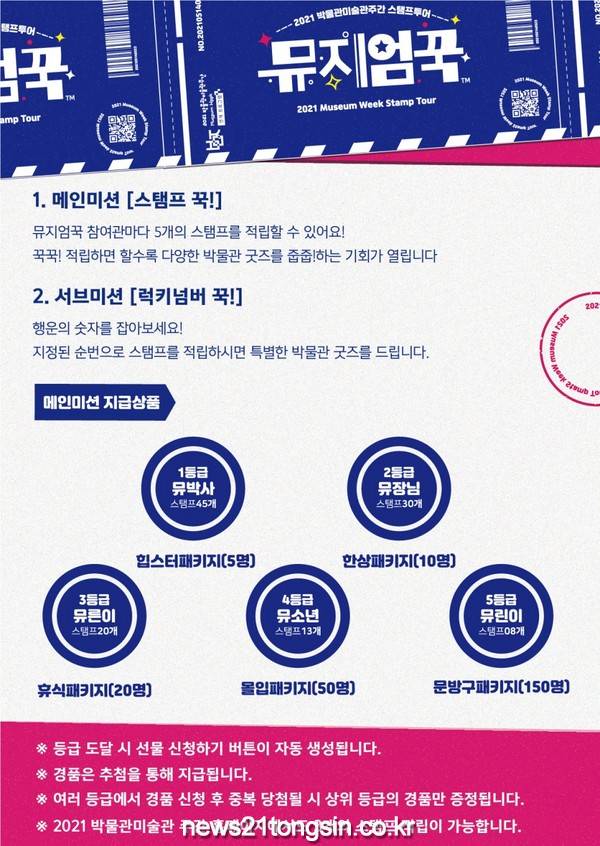‘뮤지엄꾹’은 관람객들이 박물관에 부착된 QR코드를 찾아 도장을 찍어 적립하면 추첨을 통해 등급별 기념품을 제공하는 프로그램으로 ▷전국 박물관·미술관 103곳을 방문해 ▷기관당 최대 5개의 QR코드를 찾아 도장을 찍으면 ▷적립된 도장 개수에 따라 뮤린이(8개), 뮤소년(13개), 뮤른이(20개), 뮤장님(30개), 뮤박사(45개)로 나누어 ▷문방구 종합선물(엽서, 클립펜 등)부터 반가사유상 복제품까지 다양한 기념품을 받을 수 있다.