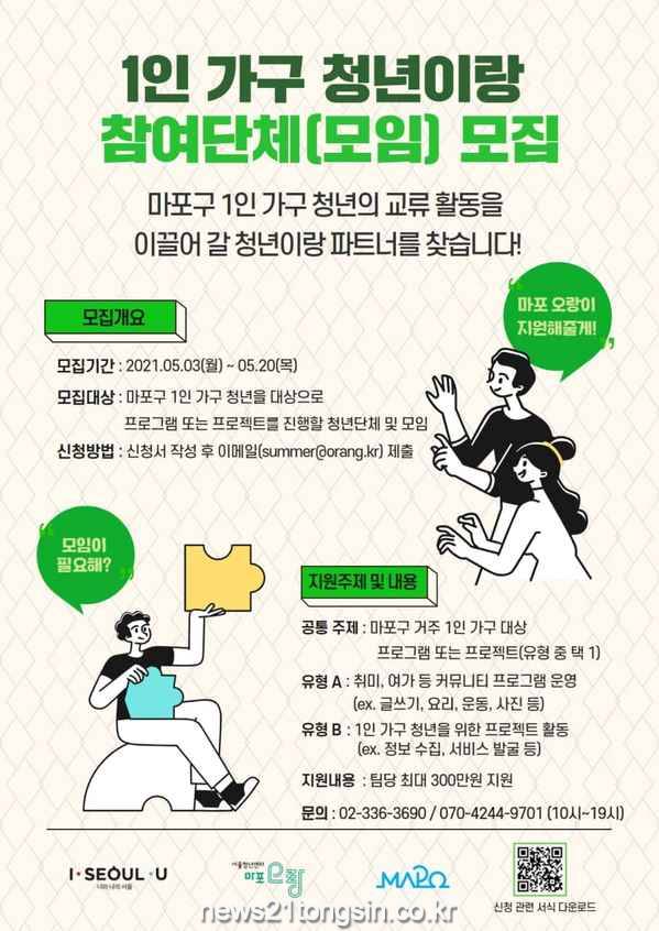 지원 자격은 마포구에 거주하거나 마포구를 기반으로 활동하는 만 19세 이상 39세 이하의 청년 2인 이상으로 구성된 단체 또는 모임으로, 마포구 내 1인 가구 청년의 취미, 여가생활, 교육활동 등을 중심으로 한 커뮤니티 기반의 관계 형성 프로그램을 운영하거나 1인 가구 청년에게 필요한 서비스 정보를 수집하고 발굴하는 프로젝트 수행이 가능한 경우 신청할 수 있으며 신청 기간은 오는 20일까지이다.