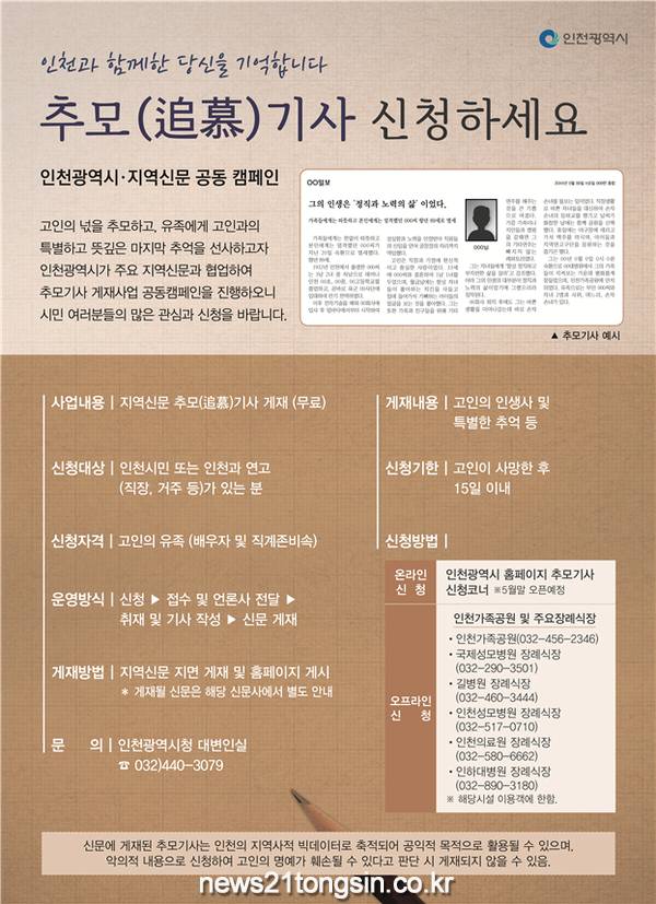 인천시가 평범한 일반 시민의 삶과 추억을 신문 지면상의 추모기사에 담아 간직할 수 있도록 시민 체감형 특색사업을 추진한다.