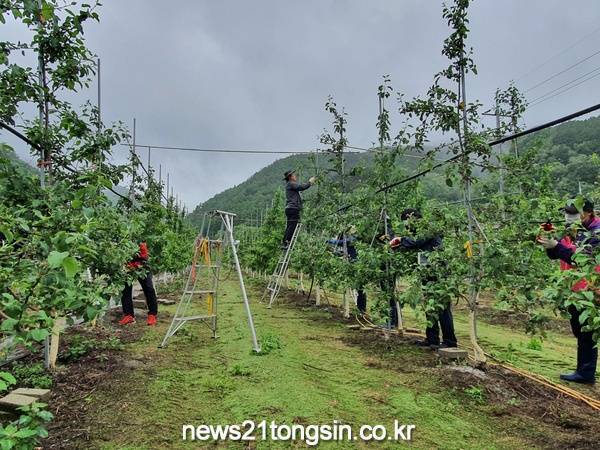 군위군 삼국유사면 직원 15명은 18일 삼국유사면 사과 재배농가를 방문하여 적과 작업 등 농촌 일손돕기를 실시했다.