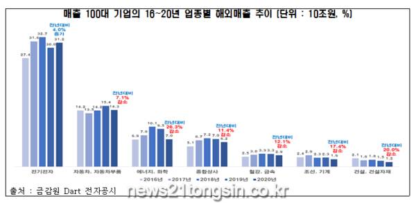전경련이 19년 기준 매출 100대 기업의 16~20년 연결기준 실적 데이터를 분석한 결과, 이들 100대 기업의 해외매출은 19년 미․중 무역전쟁, 20년 코로나 글로벌 경제위기로 2년 연속 마이너스 성장한 것으로 나타났다.