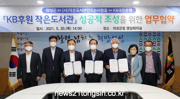 의성군은 20일 김주수 군수와 (사)작은도서관만드는사람들 김수연 대표, KB국민은행 대구경북지역영업그룹 배정호 대표 등 관계자들이 참석한 가운데 2021년 ‘KB후원 작은도서관’ 성공적 조성을 위한 업무협약을 체결했다.