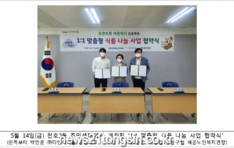 천호2동은 지난 14일 ‘해공노인복지관’, 예비사회적기업 ‘(주)다인케이블’(공동대표 김혜민?박민준)과 협약을 체결하여 지역 내 고독사 위험 1인 가구 30명에게 매월 맞춤 영양식사 및 식품을 지원하기로 했다.