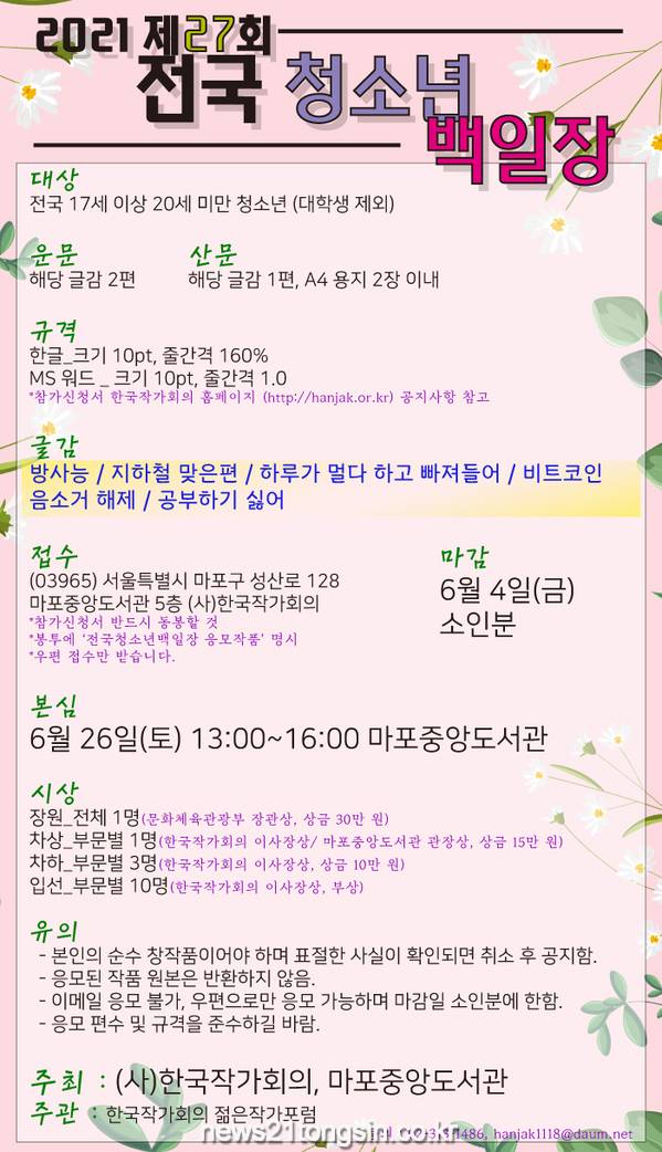 이번 백일장 대회는 전국 17세 이상 20세 미만(대학생 제외) 청소년을 대상으로 운문과 산문 2개 분야로 진행하며, ‘방사능, 지하철 맞은편, 하루가 멀다하고 빠져들어, 비트코인, 음소거 해제, 공부하기 싫어’ 6개의 글감 중 선택할 수 있다.